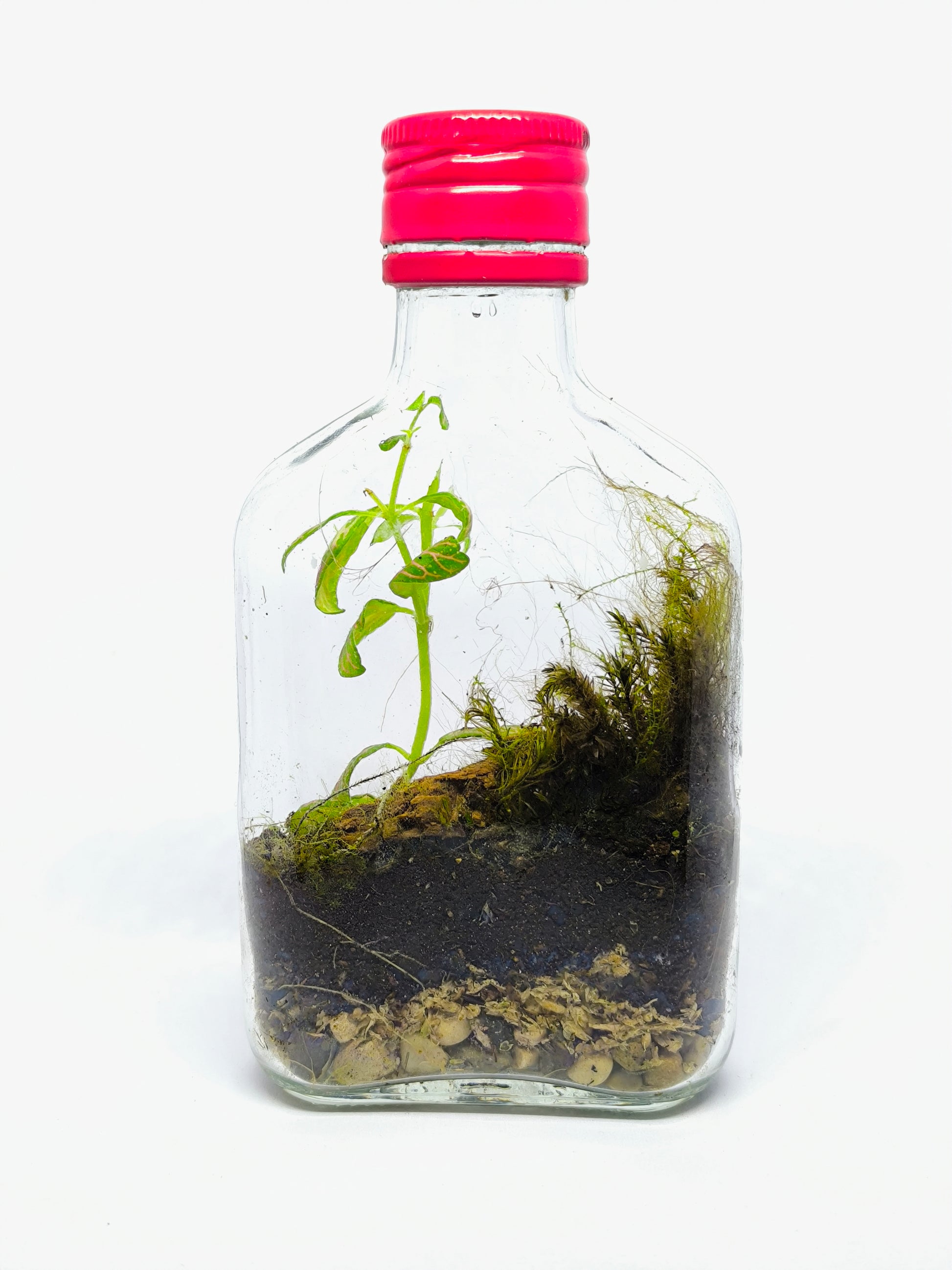 Terrarium réalisé dans une flasque d'alcool. Contenant recyclé.