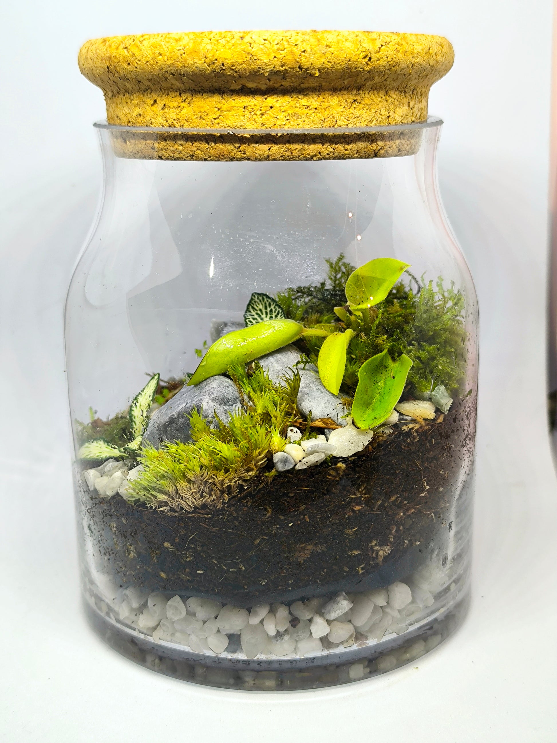Terrarium réalisé dans un contenant de seconde main en verre avec un couvercle en liège.